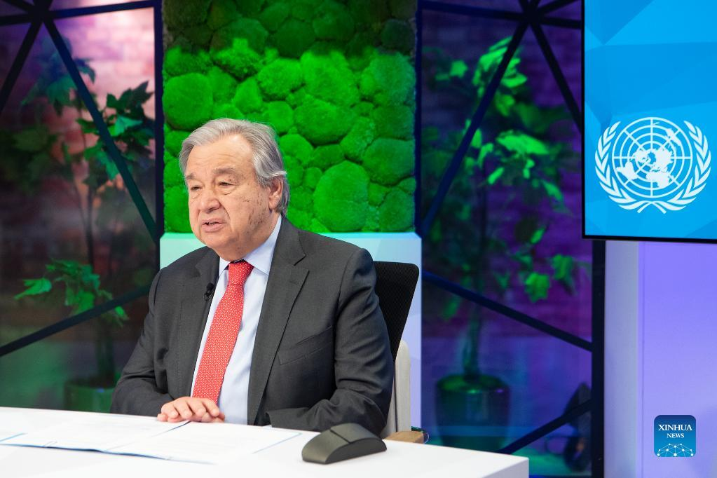 United Nations Secretary-General Antonio Guterres (1st R) addresses the virtual launch of the Access to COVID-19 Tools Accelerator (ACT-Accelerator) advocacy campaign for 2022 in New York, on Feb. 9, 2022. Guterres on Wednesday joined world leaders in calling for urgent investment to end the COVID-19 pandemic this year. (Eskinder Debebe/UN Photo/Handout via Xinhua)