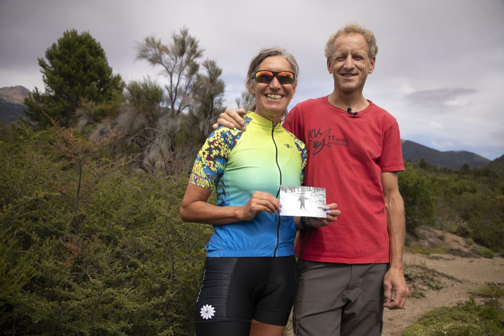 Image from February 2, 2022 of Ines Alder (L) and her husband, Jorge Dal Farra, posing with a photograph of their son Franco when he was 3 years old and was doing his first ski training, in the city from San Carlos de Bariloche, Argentina. (Xinhua/Martin Zabala)