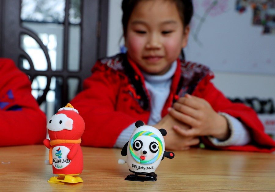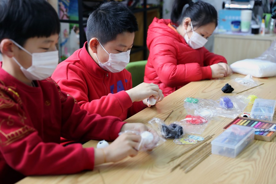 Children make Bing Dwen Dwen, the mascot for the Beijing 2022 Olympic Winter Games, and Shuey Rhon Rhon, the mascot of Beijing 2022 Paralympic Winter Games, with colored clay at Xidu sub-district of Fengxian District in east China's Shanghai, Feb. 10, 2022. (Xinhua/Liu Ying)