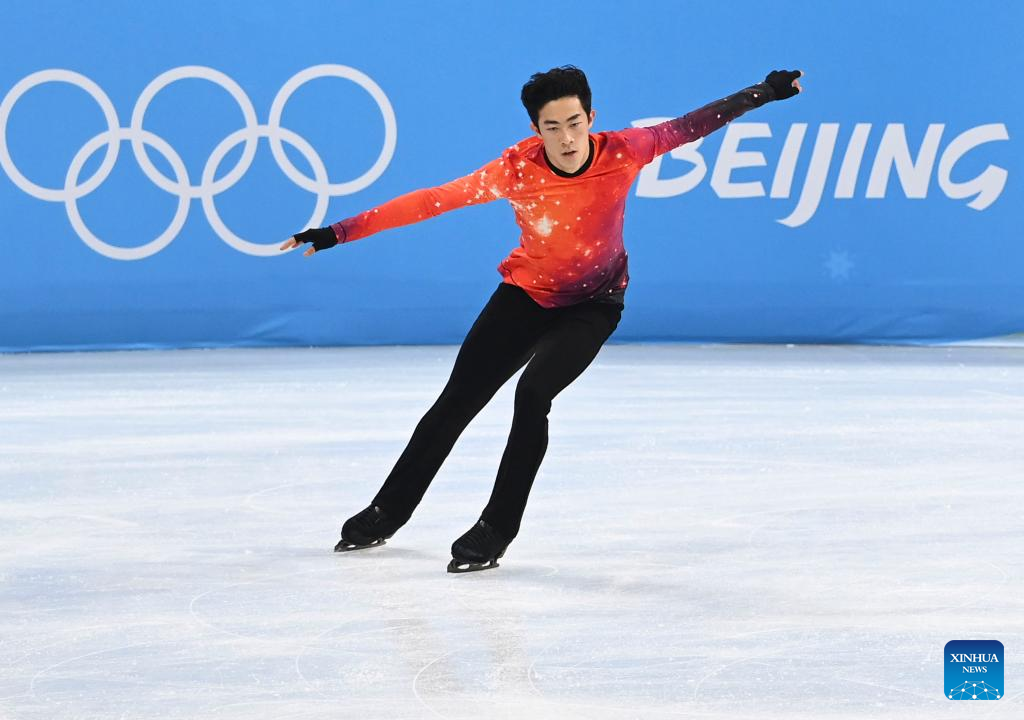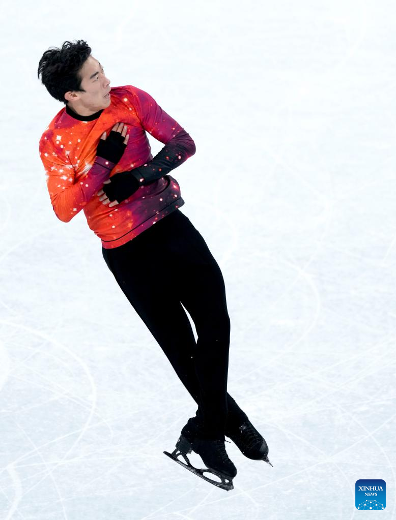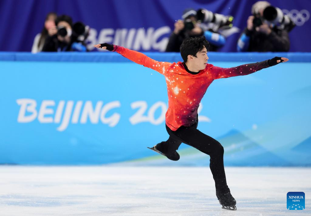 Nathan Chen of the United States performs during the figure skating men single skating free skating of the Beijing 2022 Winter Olympics at Capital Indoor Stadium in Beijing, capital of China, Feb. 10, 2022. (Xinhua/Ma Ning)