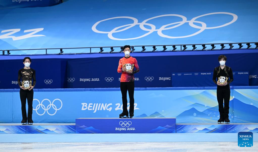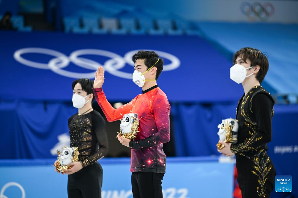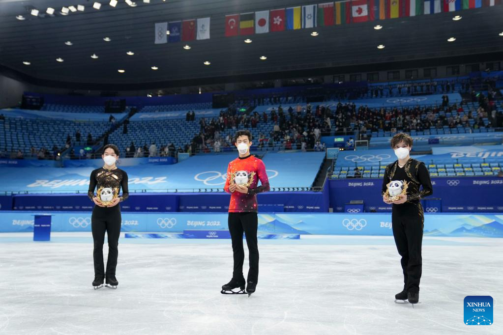 Nathan Chen (C) of the United States, Kagiyama Yuma (L) and Uno Shoma of Japan celebrate after the figure skating men single skating free skating of the Beijing 2022 Winter Olympics at Capital Indoor Stadium in Beijing, capital of China, Feb. 10, 2022. (Xinhua/Ju Huanzong)
