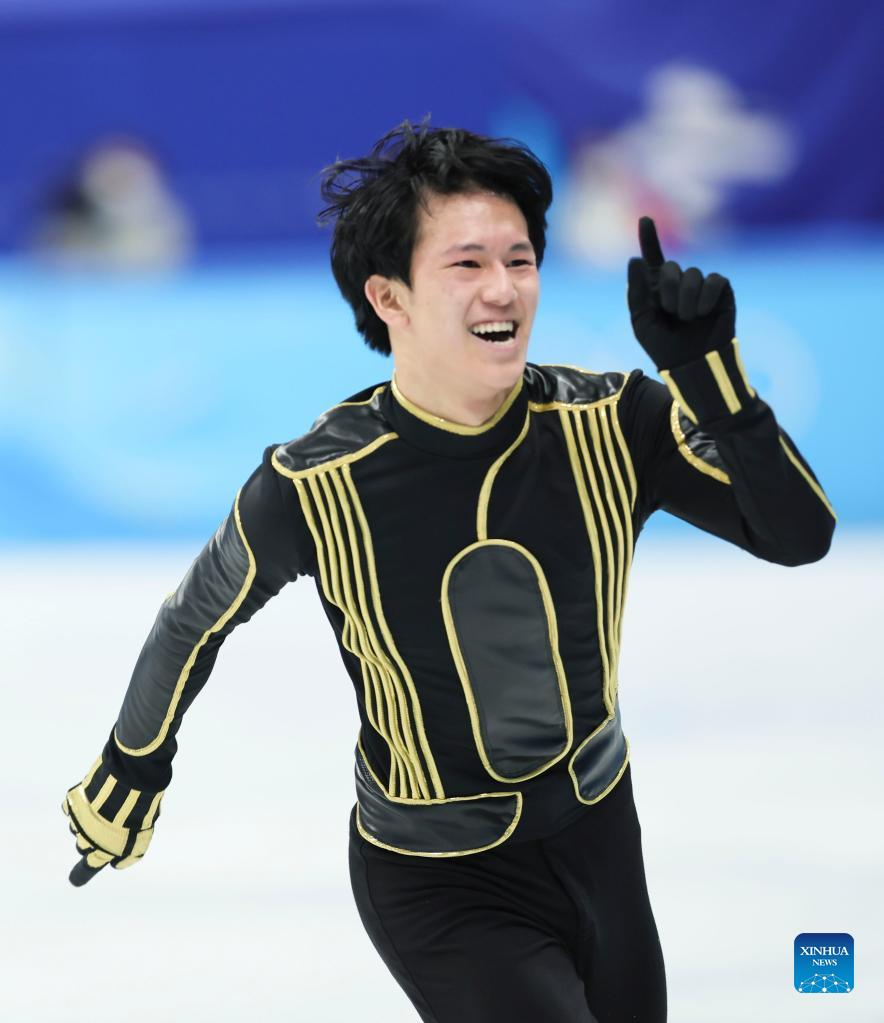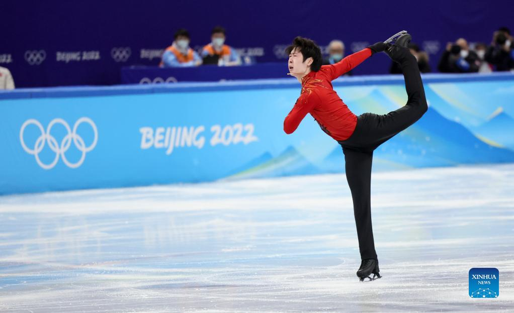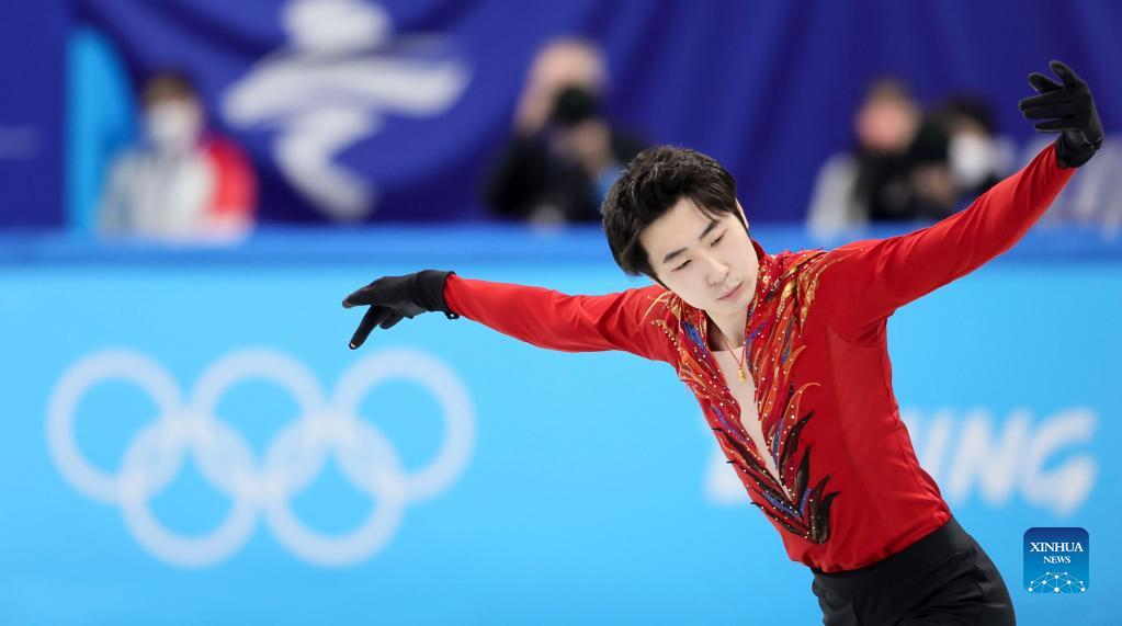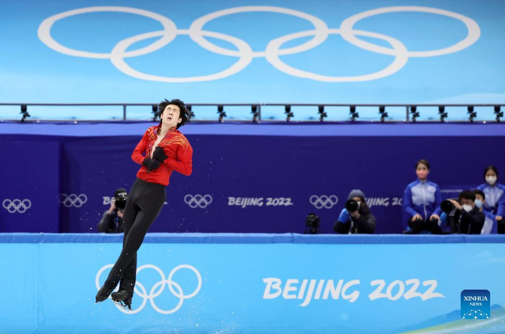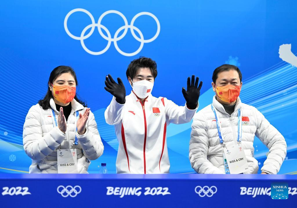 Jin Boyang of China (C) gestures after his performance during the figure skating men single skating free skating of the Beijing 2022 Winter Olympics at Capital Indoor Stadium in Beijing, capital of China, Feb. 10, 2022. (Xinhua/Ju Huanzong)