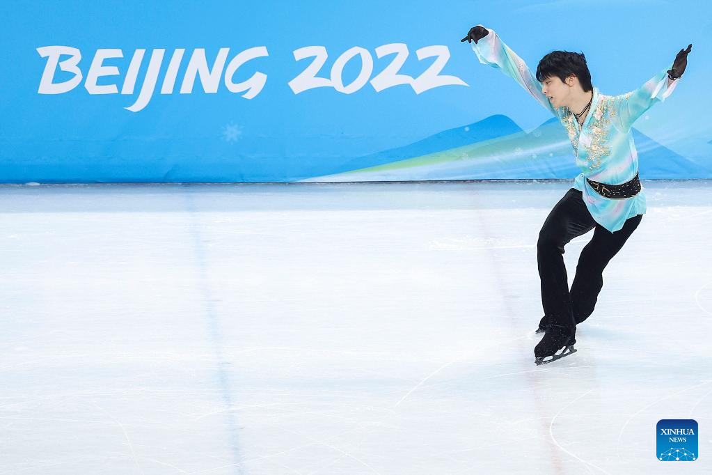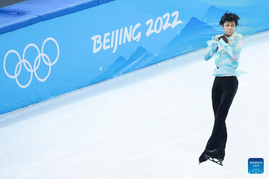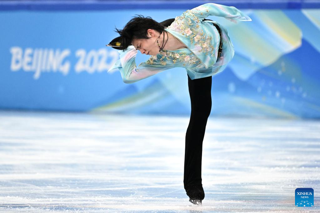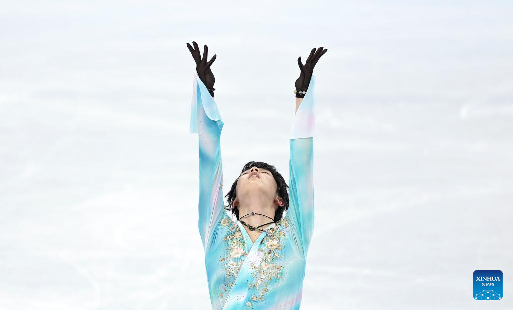 Hanyu Yuzuru of Japan performs during the figure skating men single skating free skating of the Beijing 2022 Winter Olympics at Capital Indoor Stadium in Beijing, capital of China, Feb. 10, 2022. (Xinhua/Ju Huanzong)