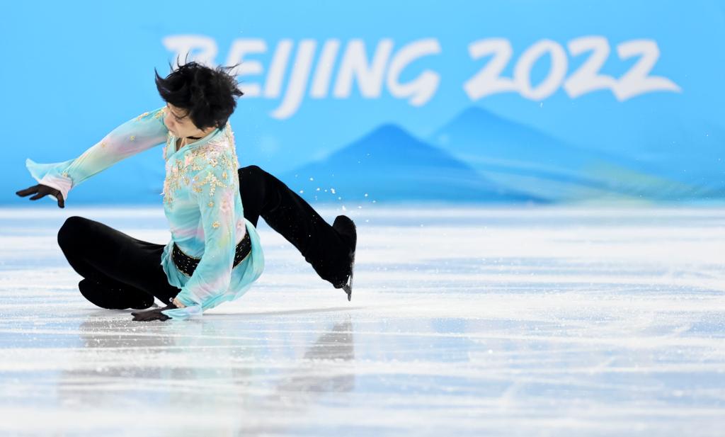 Hanyu Yuzuru of Japan falls during the figure skating men's singles skating free skating of the Beijing 2022 Winter Olympics at Capital Indoor Stadium in Beijing, capital of China, Feb. 10, 2022. (Xinhua/Lan Hongguang)