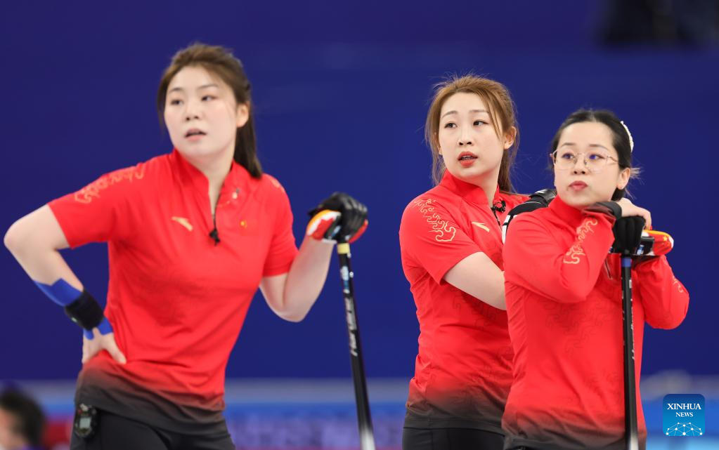 Han Yu (L) of China, Zhang Lijun (C) of China and Wang Rui of China compete during the Curling Women's Round Robin Session 2 of the Beijing 2022 Winter Olympics between China and Switzerland at the National Aquatics Centre in Beijing, capital of China, Feb. 10, 2022. (Xinhua/Lan Hongguang)
