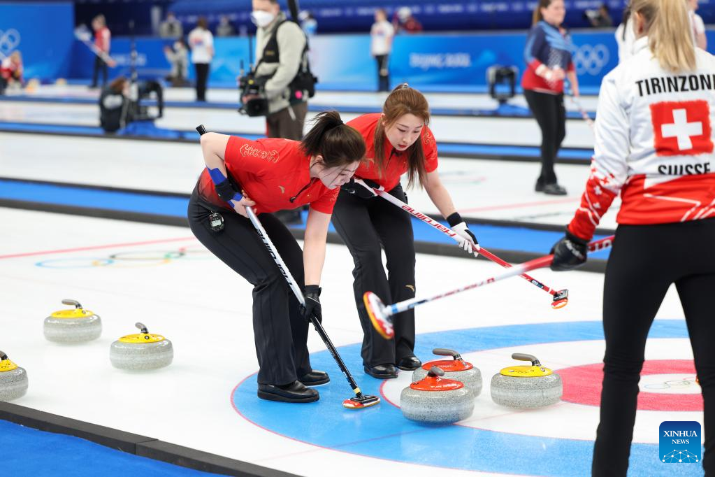 Wang Rui of China curls the stone during the Curling Women's Round Robin Session 2 of the Beijing 2022 Winter Olympics between China and Switzerland at the National Aquatics Centre in Beijing, capital of China, Feb. 10, 2022. (Xinhua/Lan Hongguang)