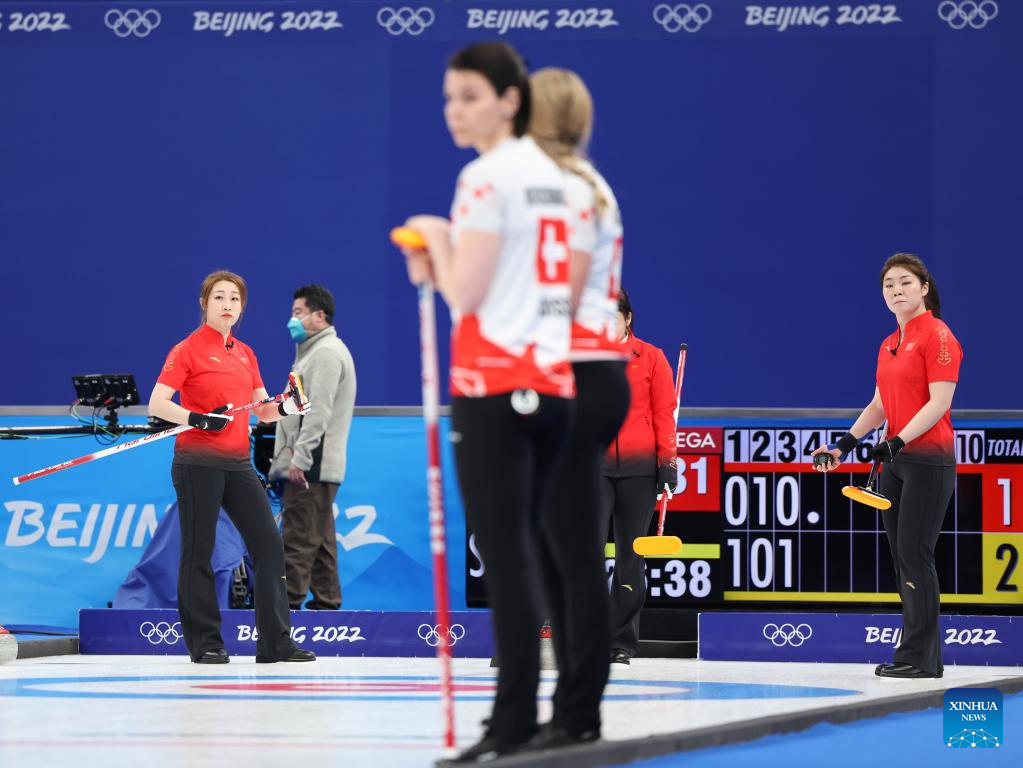 Dong Ziqi of China competes during the Curling Women's Round Robin Session 2 of the Beijing 2022 Winter Olympics between China and Switzerland at the National Aquatics Centre in Beijing, capital of China, Feb. 10, 2022. (Xinhua/Lan Hongguang)