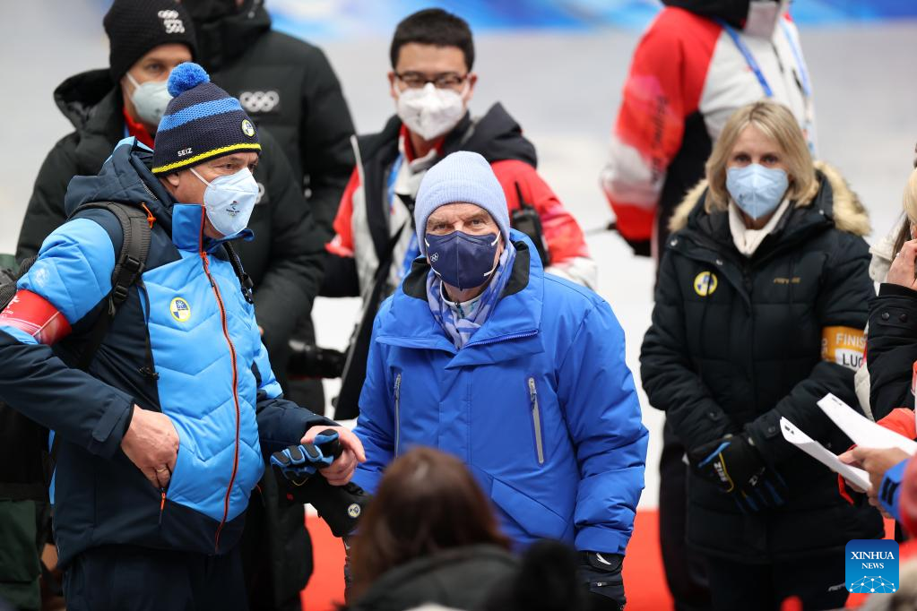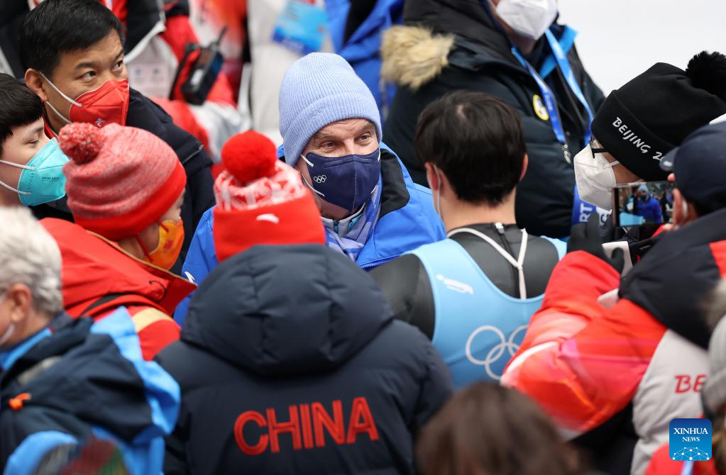 President of the International Olympic Committee Thomas Bach (C) talks with Chinese athletes during luge doubles run at the Yanqing National Sliding Centre in Yanqing district of Beijing, capital of China, Feb. 9, 2022. (Xinhua/Yao Jianfeng)