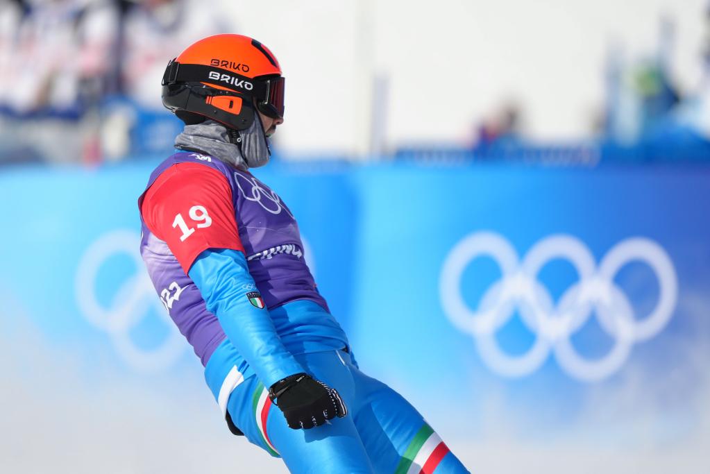 Tommaso Leoni of Italy competes during the men's snowboard cross 1/8 finals at Genting Snow Park in Zhangjiakou, north China's Hebei Province, Feb. 10, 2022. (Xinhua/Xue Yubin)