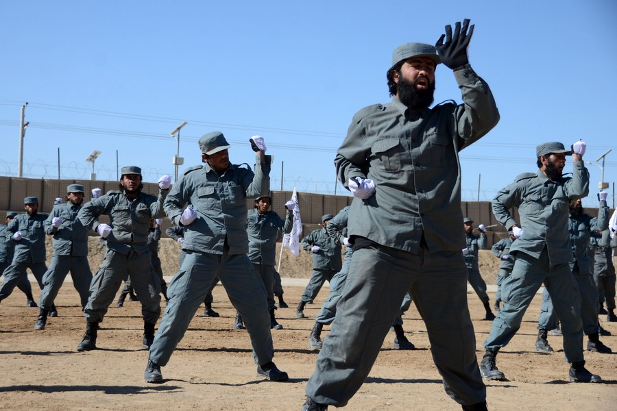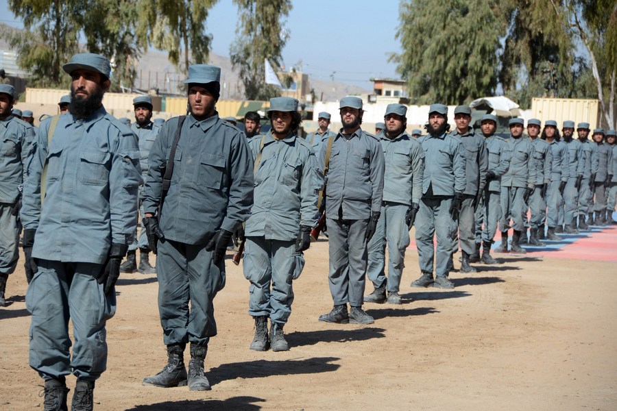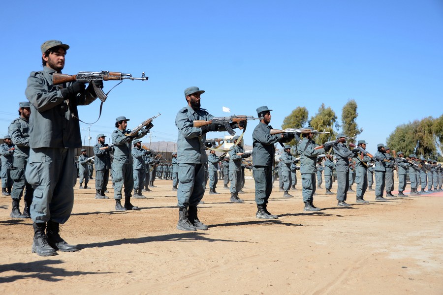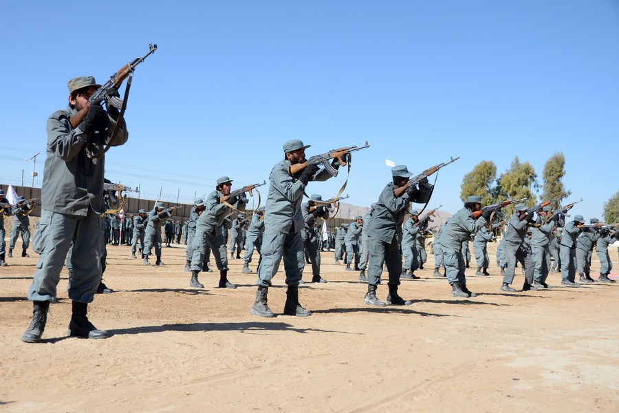 Afghan policemen attend a graduation ceremony in Daman District of Kandahar Province, Afghanistan, Feb. 9, 2022. (Photo by Sanaullah Seiam/Xinhua)