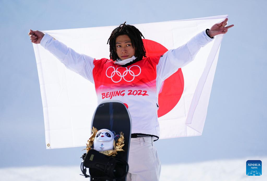 Hirano Ayumu of Japan competes during the flower ceremony after the men's snowboard halfpipe final at Genting Snow Park in Zhangjiakou, north China's Hebei Province, Feb. 11, 2022. (Xinhua/Xu Chang)