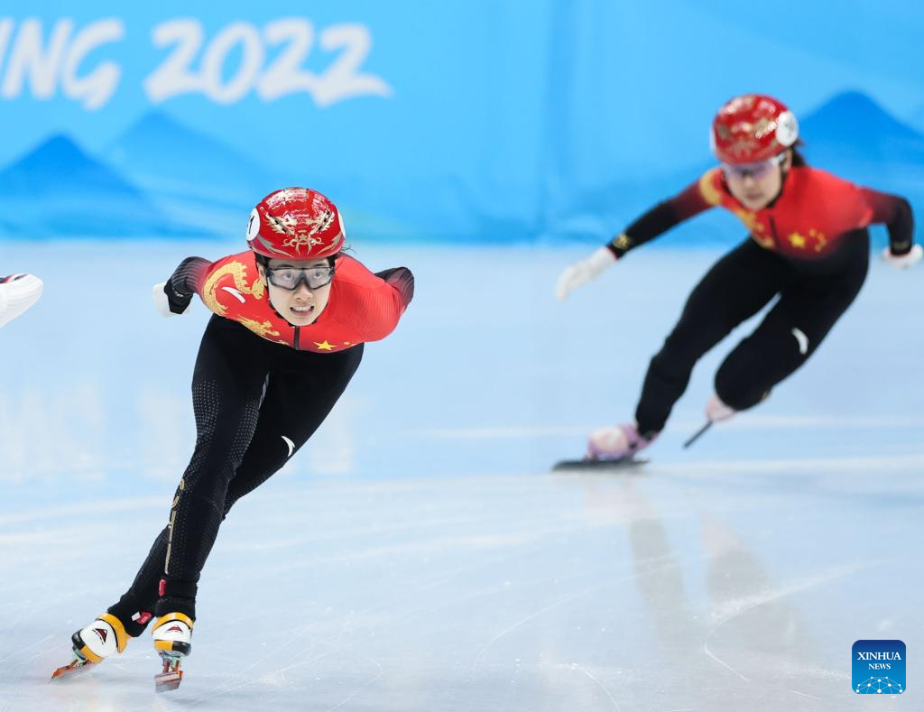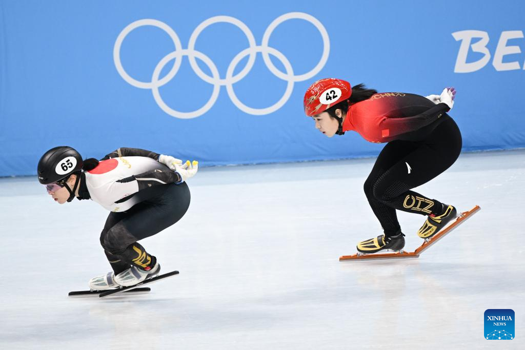 Qu Chunyu (L) of China competes during the women's 1,000m short track speed skating quarterfinal at Capital Indoor Stadium in Beijing, capital of China, Feb. 11, 2022. (Xinhua/Lan Hongguang)