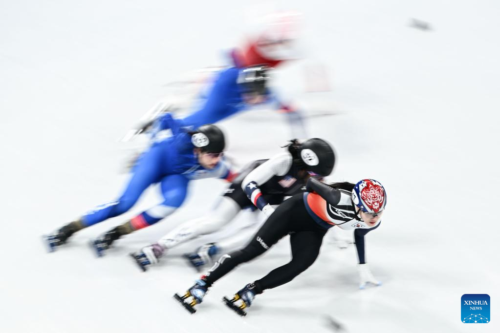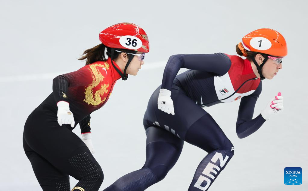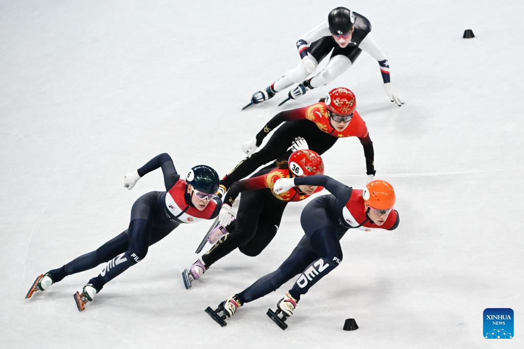 Han Yutong (2nd L) of China and Suzanne Schulting (2nd front) of the Netherlands compete during the women's 1,000m short track speed skating quarterfinal at Capital Indoor Stadium in Beijing, capital of China, Feb. 11, 2022. (Xinhua/Yang Lei)