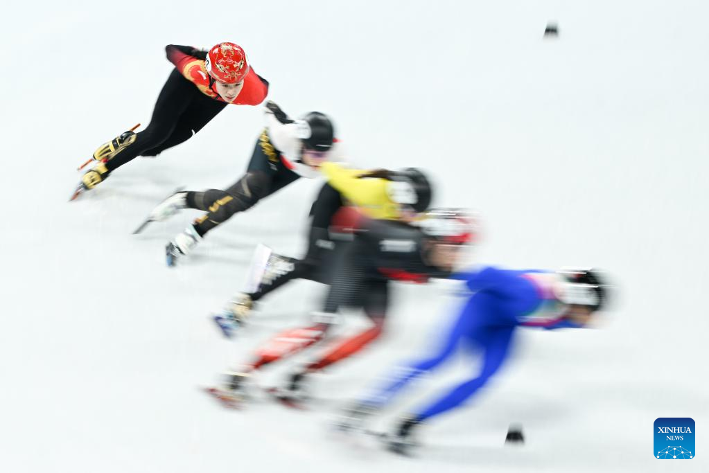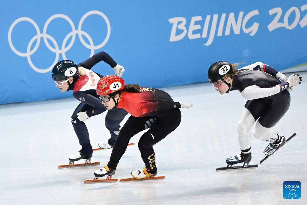Zhang Chutong (1st L) of China competes during the women's 1,000m short track speed skating quarterfinal at Capital Indoor Stadium in Beijing, capital of China, Feb. 11, 2022. (Xinhua/Ju Huanzong)