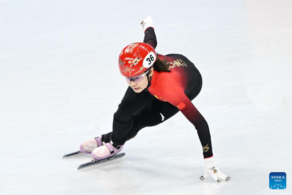 Han Yutong of China competes during the women's 1,000m short track speed skating quarterfinal at Capital Indoor Stadium in Beijing, capital of China, Feb. 11, 2022. (Xinhua/Ju Huanzong)