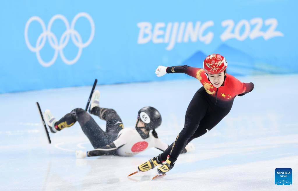 Kikuchi Sumire (1st R) of Japan and Zhang Chutong (2nd R) of China clash during the women's 1,000m short track speed skating quarterfinal at Capital Indoor Stadium in Beijing, capital of China, Feb. 11, 2022. (Xinhua/Lan Hongguang)
