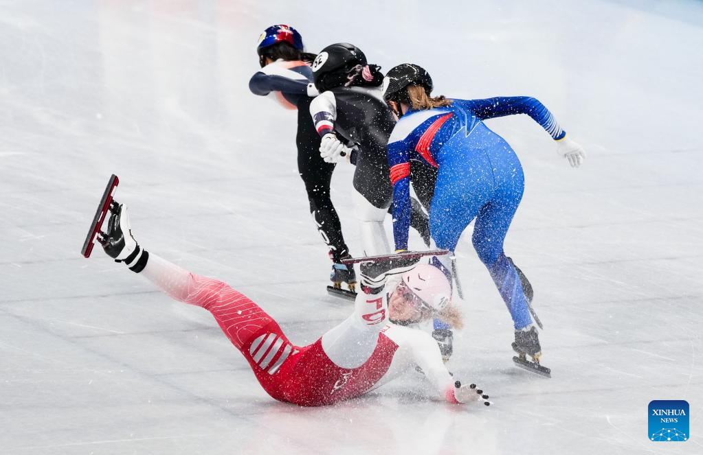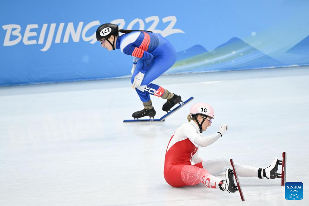 Natalia Maliszewska (front) of Poland falls onto the ice rink during the women's 1,000m short track speed skating quarterfinal at Capital Indoor Stadium in Beijing, capital of China, Feb. 11, 2022. (Xinhua/Wang Yuguo)