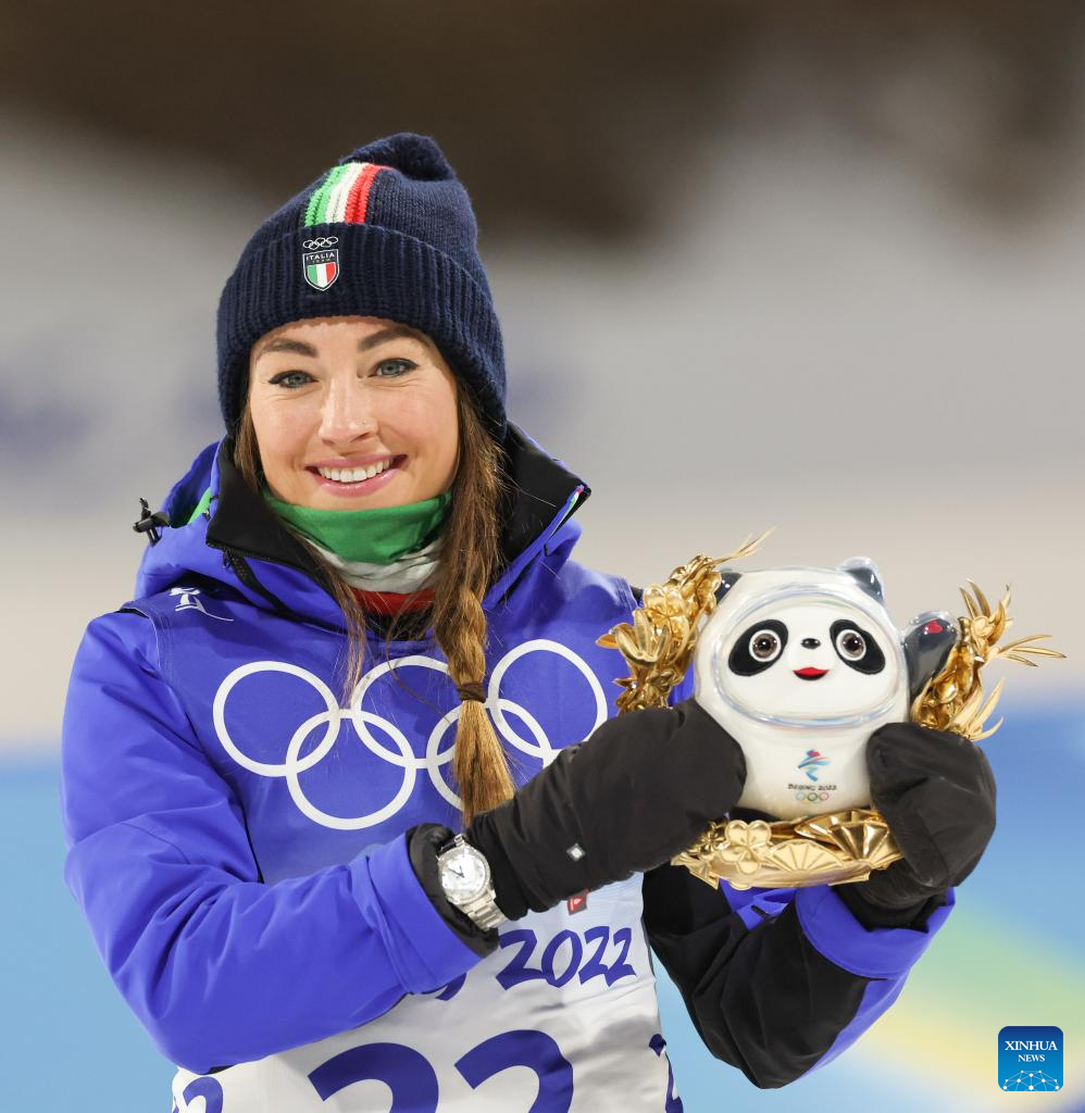 Dorothea Wierer of Italy celebrates winning the third place of biathlon women's 7.5km sprint at National Biathlon Centre in Zhangjiakou, north China's Hebei Province, Feb. 11, 2022. (Xinhua/Ding Ting)