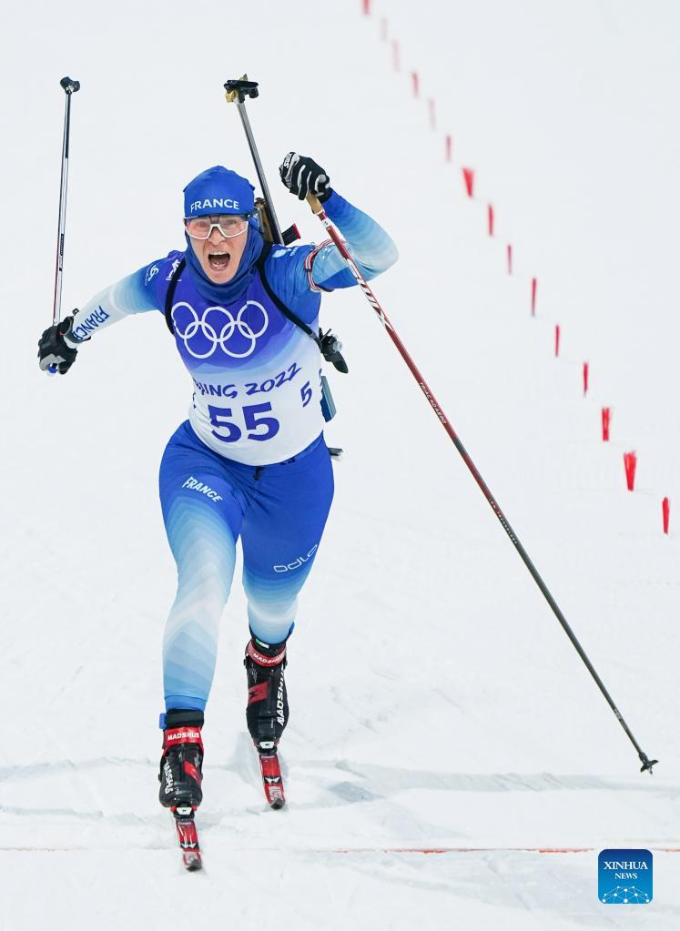 Anais Bescond of France competes during biathlon women's 7.5km sprint at National Biathlon Centre in Zhangjiakou, north China's Hebei Province, Feb. 11, 2022. (Xinhua/Jiang Hongjing)