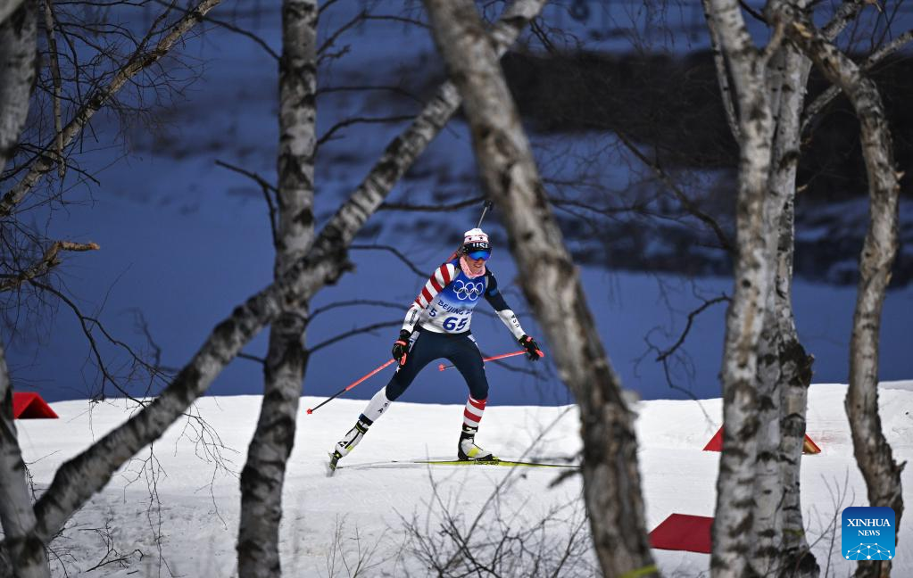 Joanne Reid of the United States competes during biathlon women's 7.5km sprint at National Biathlon Centre in Zhangjiakou, north China's Hebei Province, Feb. 11, 2022. (Xinhua/Guo Cheng)