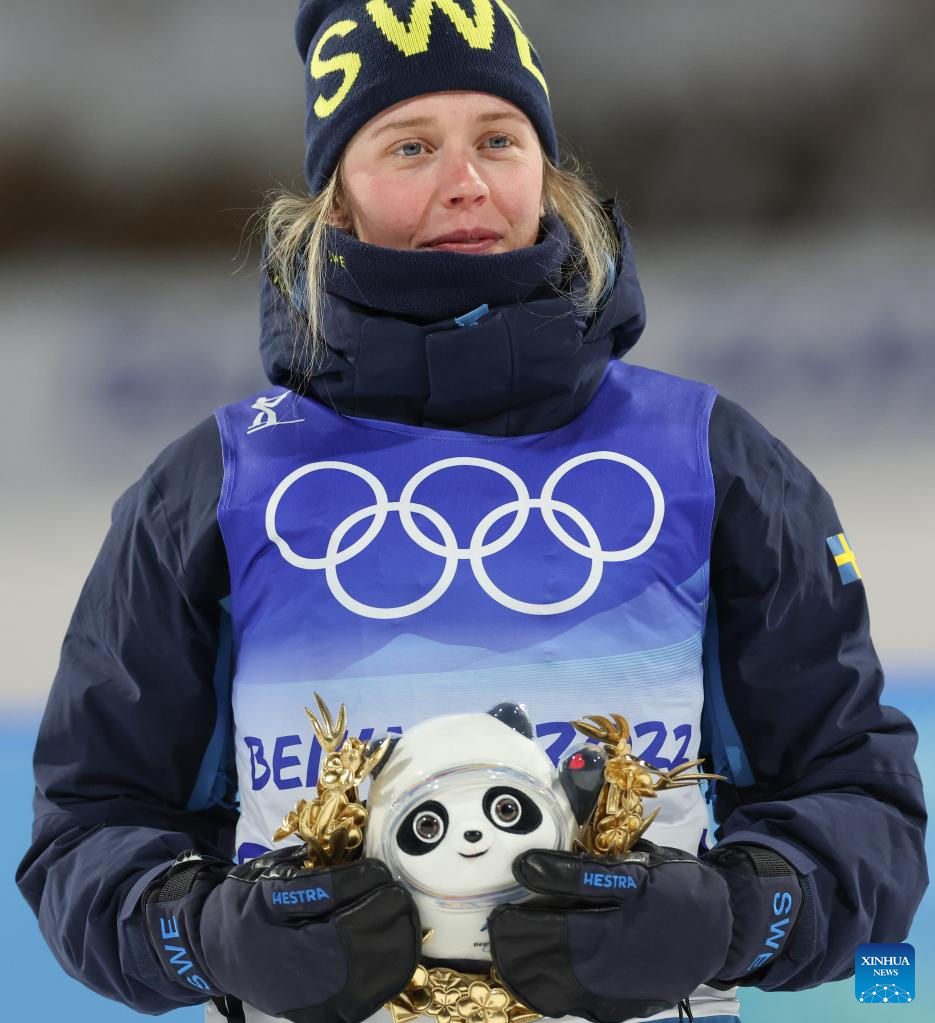Elvira Oeberg of Sweden celebrates winning the second place of biathlon women's 7.5km sprint at National Biathlon Centre in Zhangjiakou, north China's Hebei Province, Feb. 11, 2022. (Xinhua/Ding Ting)