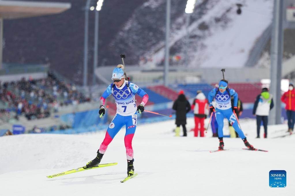 Kristina Reztsova (L) of ROC competes during biathlon women's 7.5km sprint at National Biathlon Centre in Zhangjiakou, north China's Hebei Province, Feb. 11, 2022. (Xinhua/Peng Ziyang)