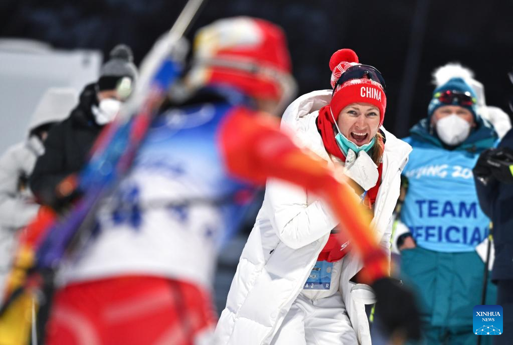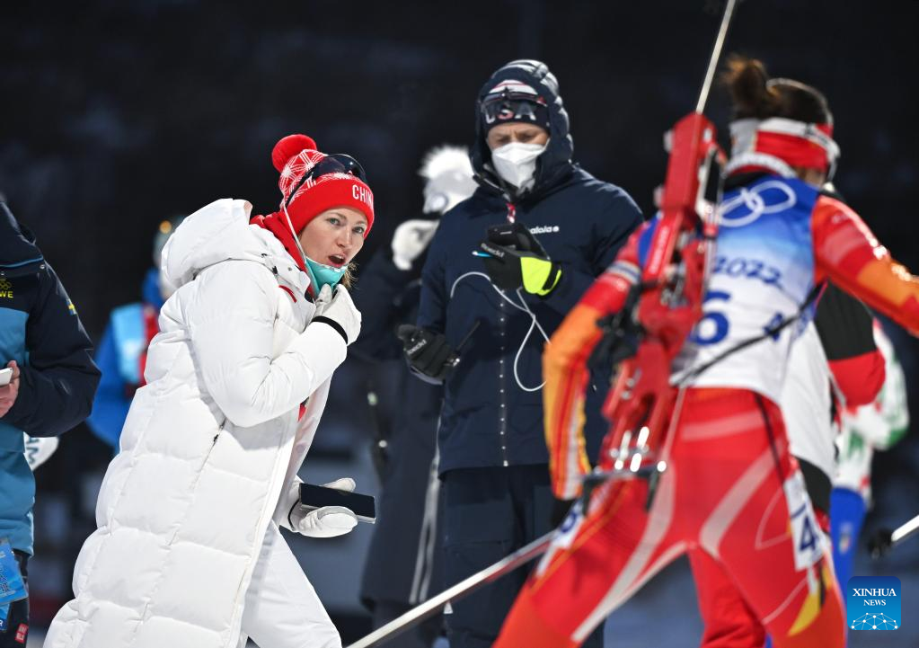 Darya Domracheva (2nd R), coach of the Chinese team shouts during biathlon women's 7.5km sprint at National Biathlon Centre in Zhangjiakou, north China's Hebei Province, Feb. 11, 2022. (Xinhua/Guo Cheng)