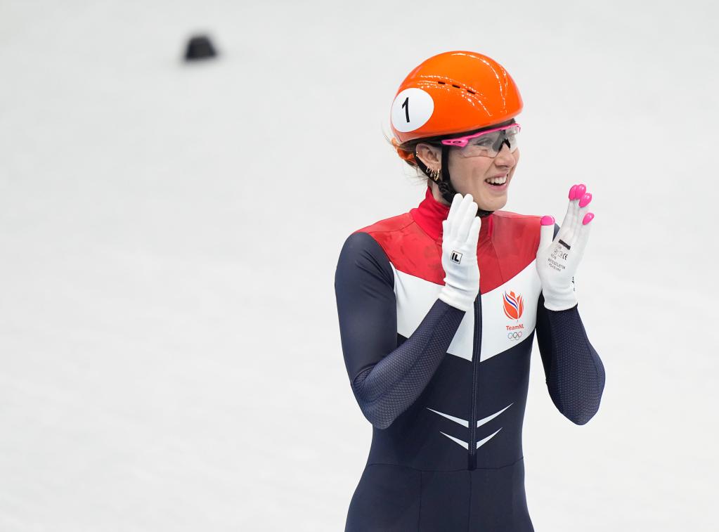 Suzanne Schulting of the Netherlands reacts during the women's 1,000m quarterfinal of short track speed skating at Capital Indoor Stadium in Beijing, capital of China, Feb. 11, 2022. (Xinhua/Xiong Qi)