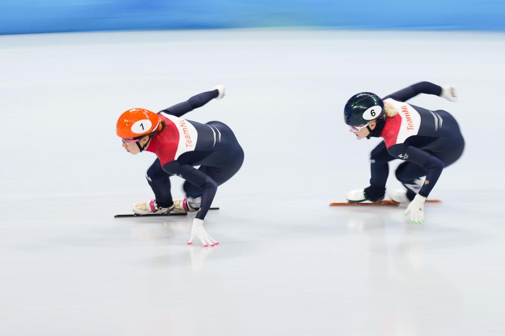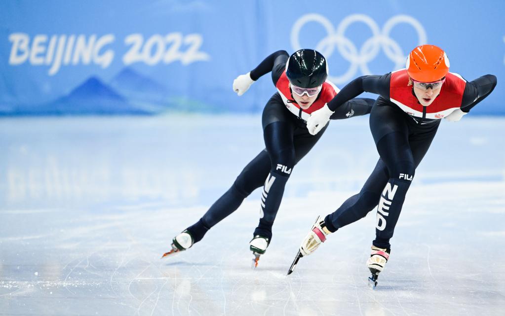Suzanne Schulting (L) of the Netherlands competes during the women's 1,000m quarterfinal of short track speed skating at Capital Indoor Stadium in Beijing, capital of China, Feb. 11, 2022. (Xinhua/Xiong Qi)