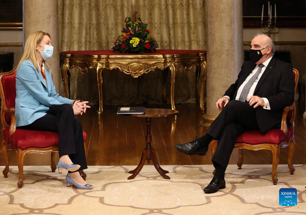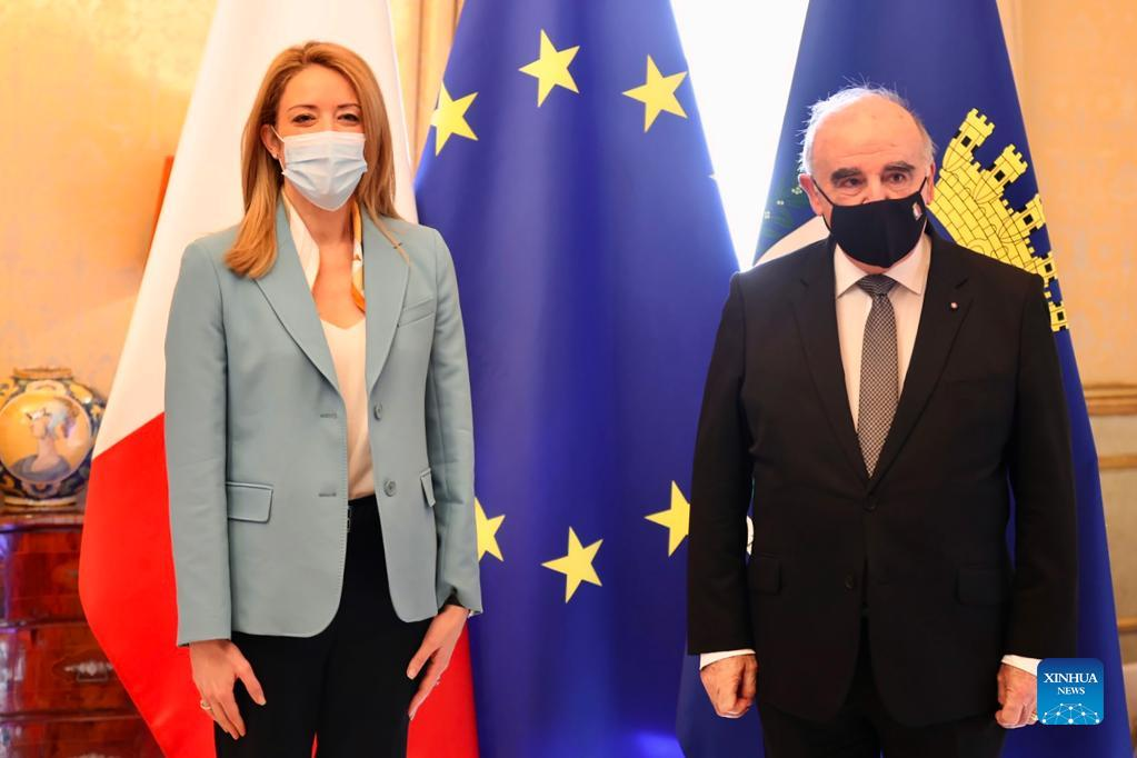 Maltese President George Vella (R) meets with the visiting President of the European Parliament Roberta Metsola in San Anton Palace, Attard, Malta, on Feb. 10, 2022. (Photo by Jonathan Borg/Xinhua)