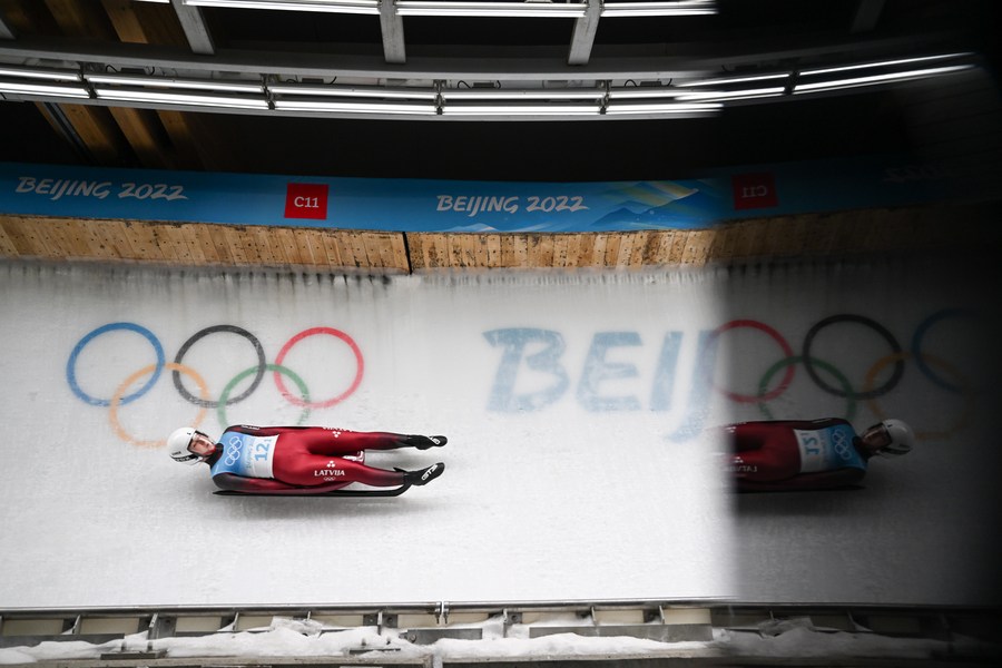 Tiruma of Latvia competes during the luge team relay competition at the Yanqing National Sliding Centre in Yanqing District of Beijing, capital of China, Feb. 10, 2022. (Xinhua/Sun Fei)