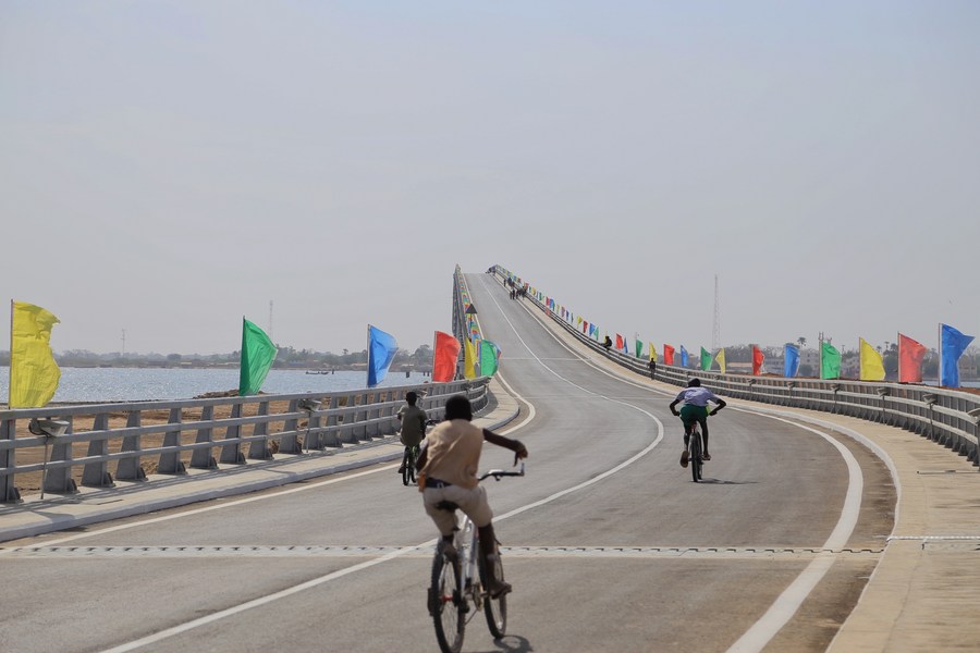 People ride bikes on the Foundiougne Bridge in Fatick, Senegal, Jan. 16, 2022. The Chinese-built bridge provides a facility of transportation to local residents. (Xinhua/Wang Zizheng)