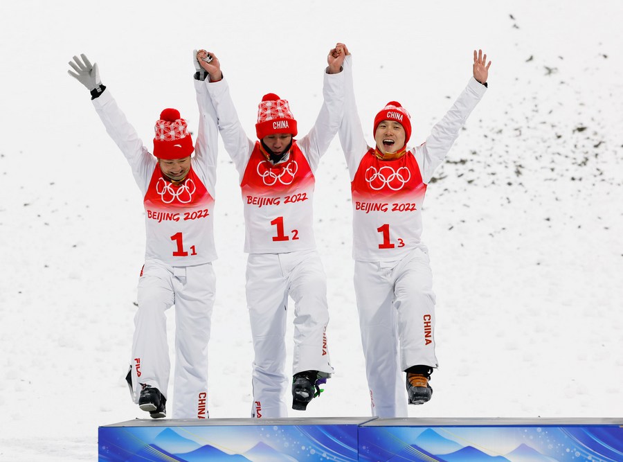 Silver medalists Jia Zongyang (C), Xu Mengtao (L) and Qi Guangpu of China celebrate during the flower ceremony after the freestyle skiing mixed team aerials final at Genting Snow Park in Zhangjiakou, north China's Hebei Province, Feb. 10, 2022. (Xinhua/Fei Maohua)