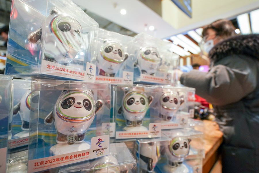 Photo taken on Feb. 10, 2022 shows Bing Dwen Dwen products at a licensed merchandise store of the Beijing 2022 Olympic Winter Games in Nanjing, east China's Jiangsu Province. (Xinhua/Li Bo)