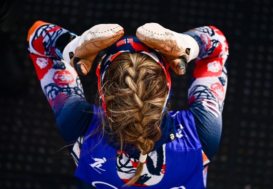 Therese Johaug of Norway reacts during cross-country skiing women's 10km classic at National Cross-Country Skiing Centre in Zhangjiakou, north China's Hebei Province, Feb. 10, 2022. (Xinhua/Zhang Hongxiang)