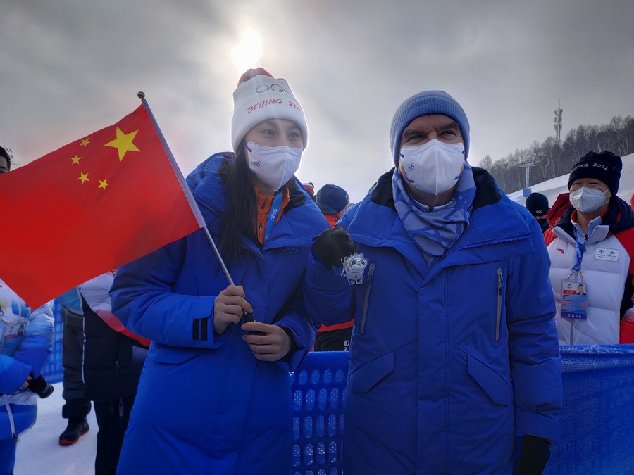 President of the International Olympic Committee Thomas Bach (R, front) and IOC member Zhang Hong pose for photos during the women's snowboard halfpipe final of the Beijing 2022 Winter Olympics at Genting Snow Park in Zhangjiakou, north China's Hebei Province, Feb. 10, 2022. (Xinhua/Wang Haofei)
