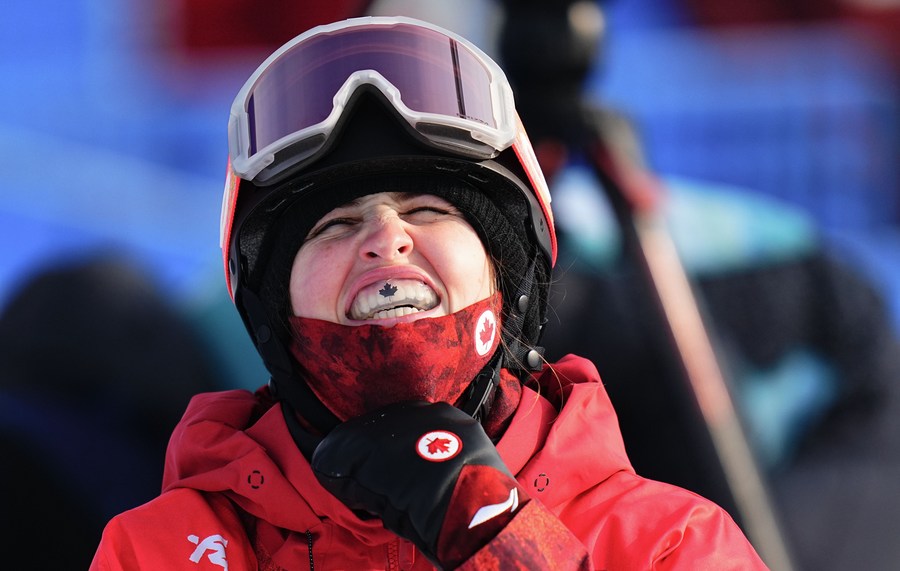 Elizabeth Hosking of Canada reacts during the women's snowboard halfpipe final at Genting Snow Park in Zhangjiakou, north China's Hebei Province, Feb. 10, 2022. (Xinhua/Xu Chang)