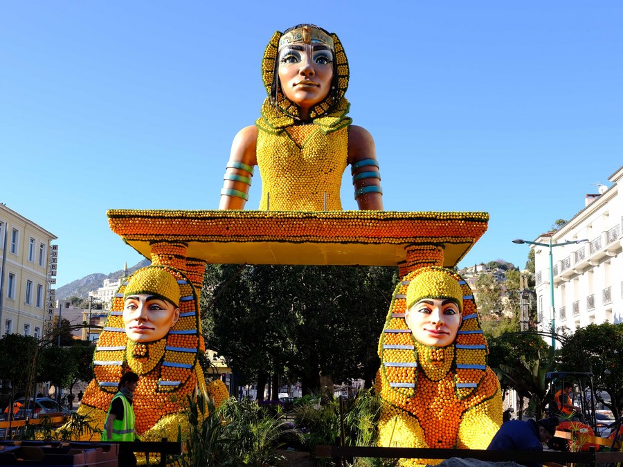 An installation decorated with lemons and oranges is seen during preparations for the annual Lemon Festival in Menton, France, on Feb. 9, 2022. The 2022 Menton Lemon Festival will be held from Feb. 12 to Feb. 27. (Photo by Serge Haouzi/Xinhua)