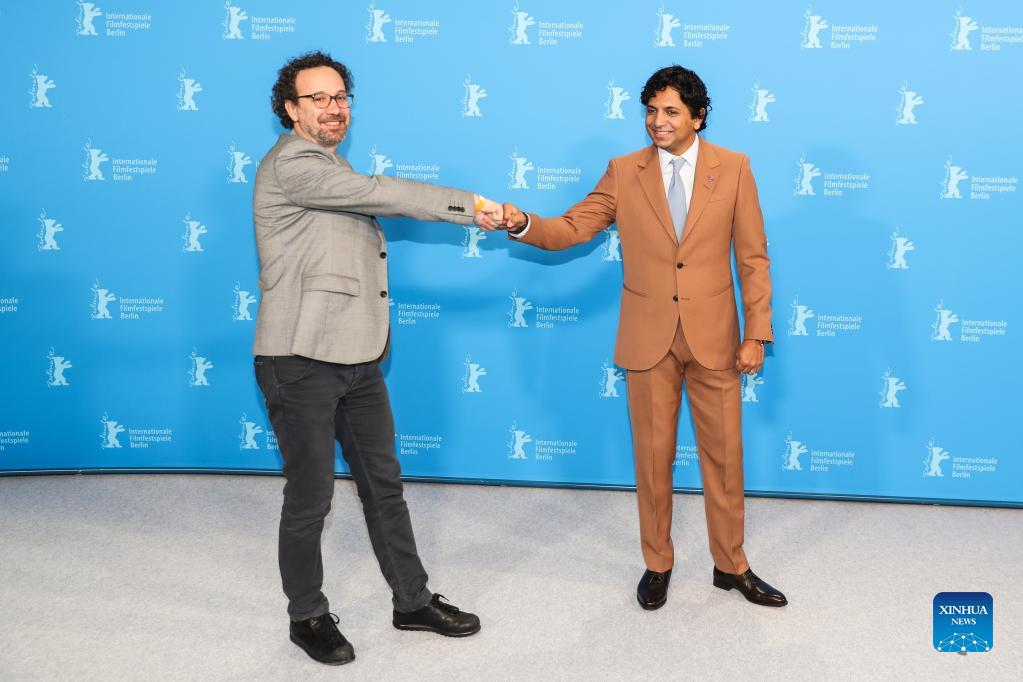President of the Berlinale 2022 international jury M. Night Shyamalan (R) and Berlinale Artistic Director Carlo Chatrian attend a photocall during the Berlin International Film Festival in Berlin, capital of Germany, Feb. 10, 2022. The 72nd Berlin International Film Festival, also known as the Berlinale, is scheduled to kick off on Feb. 10 and last until Feb. 20. (Xinhua/Shan Yuqi)