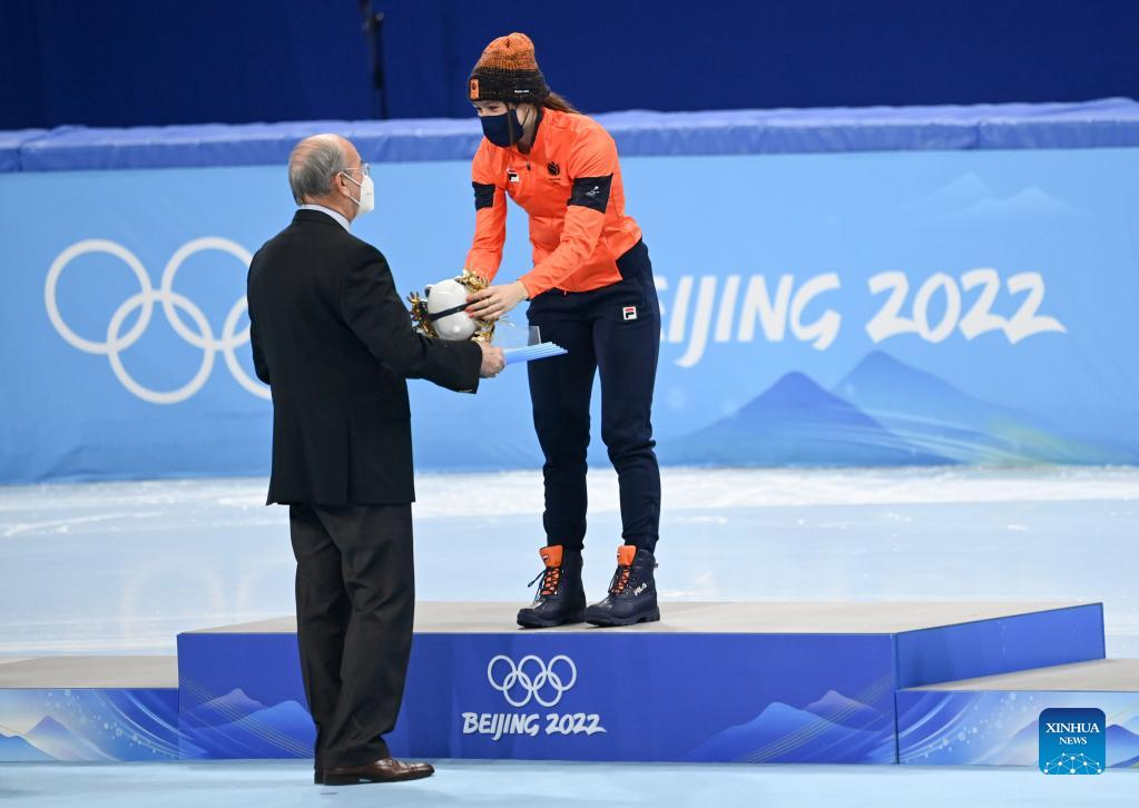 Suzanne Schulting of the Netherlands attends the flower ceremony after the women's 1,000m final of short track speed skating at Capital Indoor Stadium in Beijing, capital of China, Feb. 11, 2022. (Xinhua/Ma Ning)