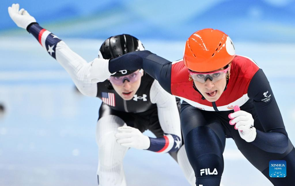 Suzanne Schulting (1st L) of the Netherlands competes during the women's 1,000m final of short track speed skating at Capital Indoor Stadium in Beijing, capital of China, Feb. 11, 2022. (Xinhua/Li Yibo)