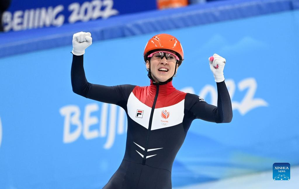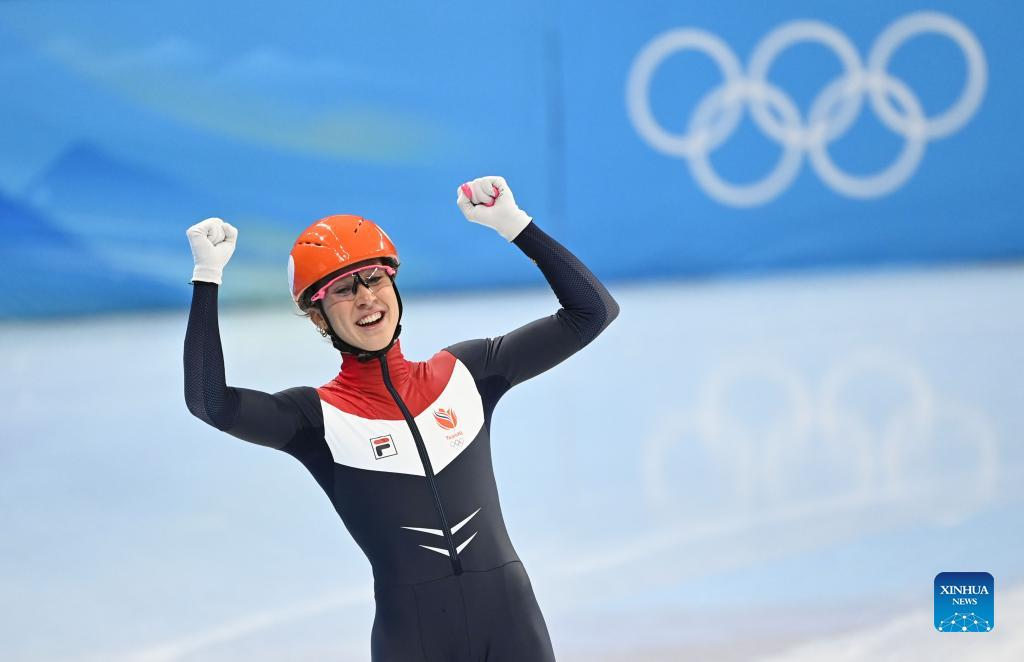 Suzanne Schulting of the Netherlands celebrates after the women's 1,000m final of short track speed skating at Capital Indoor Stadium in Beijing, capital of China, Feb. 11, 2022. (Xinhua/Ma Ning)