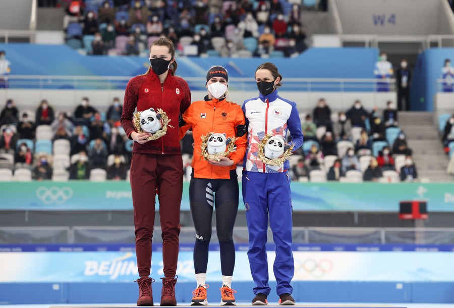 Irene Schouten (C) of the Netherlands, Isabelle Weidemann (L) of Canada and Martina Sablikova of the Czech Republic attend the flower ceremony after the speed skating women's 5,000m event at the National Speed Skating Oval in Beijing, capital of China, Feb. 10, 2022. (Xinhua/Cheng Tingting)■