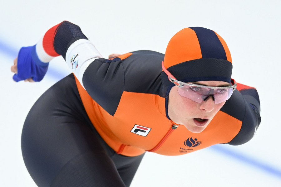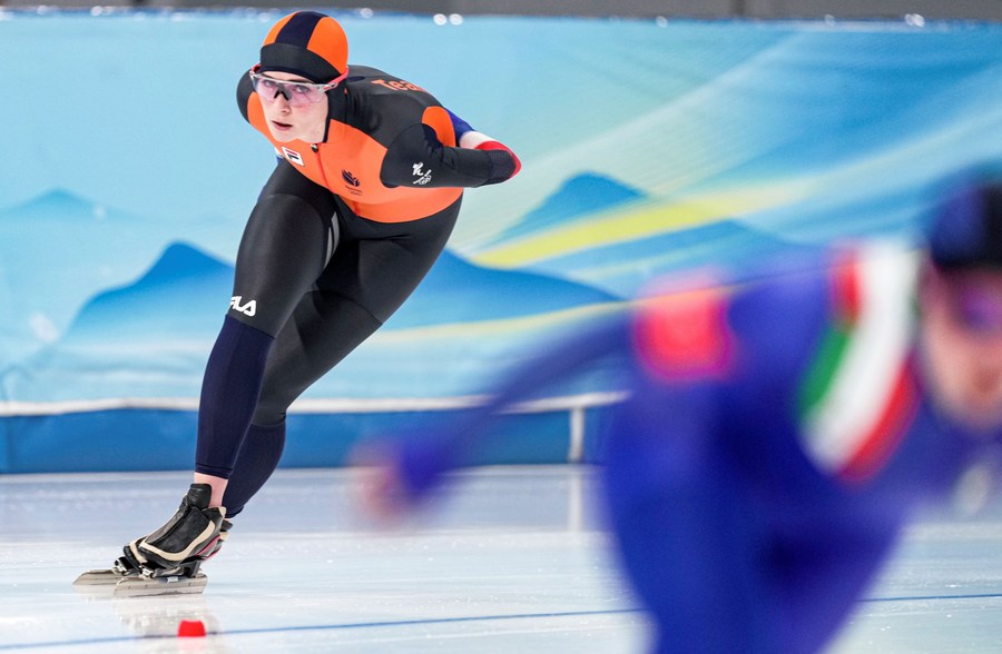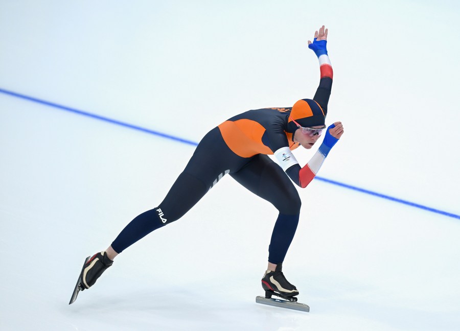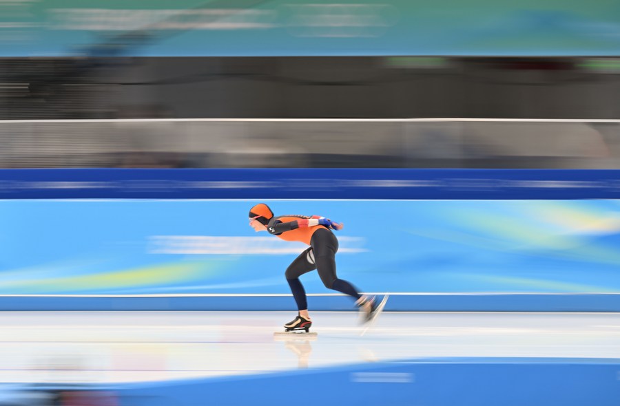 Irene Schouten of the Netherlands competes during the speed skating women's 5,000m event at the National Speed Skating Oval in Beijing, capital of China, Feb. 10, 2022. (Xinhua/Wu Wei)