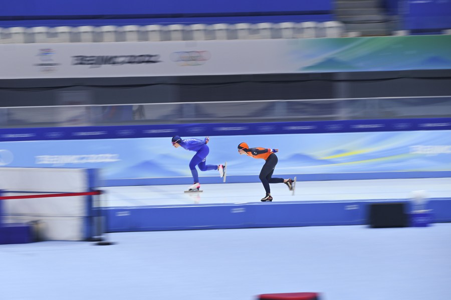 Irene Schouten (R) of the Netherlands competes during the speed skating women's 5,000m event at the National Speed Skating Oval in Beijing, capital of China, Feb. 10, 2022. (Xinhua/Huang Xiaobang)
