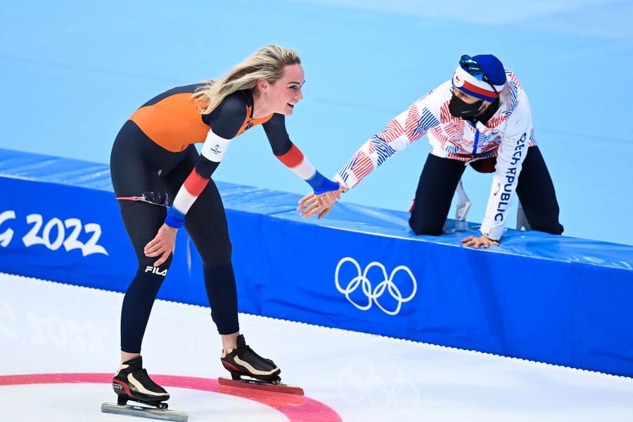 Martina Sablikova (R) of the Czech Republic congratulates Irene Schouten of the Netherlands after the speed skating women's 5,000m event at the National Speed Skating Oval in Beijing, capital of China, Feb. 10, 2022. (Xinhua/Wu Wei)