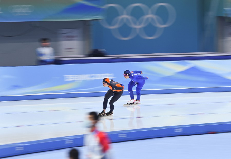 Irene Schouten (2nd R) of the Netherlands competes during the speed skating women's 5,000m event at the National Speed Skating Oval in Beijing, capital of China, Feb. 10, 2022. (Xinhua/Huang Xiaobang)