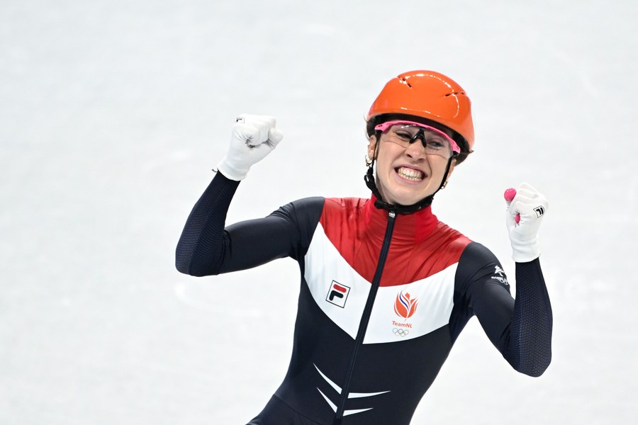 Suzanne Schulting of the Netherlands celebrates after winning the gold medal in the women's 1,000m short track speed skating final at Capital Indoor Stadium in Beijing, capital of China, Feb. 11, 2022. (Xinhua/Ju Huanzong)