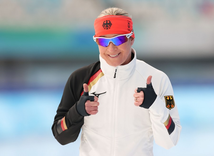 Claudia Pechstein of Germany gives a thumbs-up sign before the women's 3,000m final of speed skating at the National Speed Skating Oval in Beijing, capital of China, Feb. 5, 2022. (Xinhua/Ding Xu)