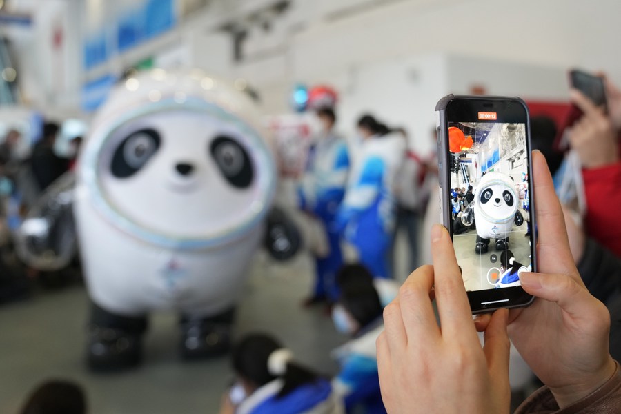 A participant takes photos of "Bing Dwen Dwen", the mascot of Beijing 2022 Winter Olympics, in Beijing, capital of China, Feb. 12, 2022. The Main Media Center of Beijing Winter Olympics held on Saturday a group interview to introduce the design concept of "Bing Dwen Dwen", the mascot of Beijing 2022 Winter Olympics, and invited "Bing Dwen Dwen" to interact on the spot. (Xinhua/Ju Huanzong)